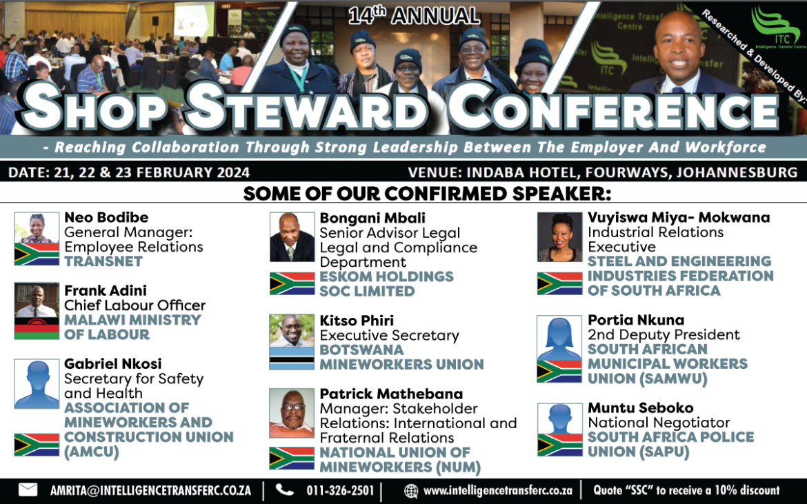 Intelligence Transfer Centre (ITC) have organised the 14th Annual Shop Steward Conference, taking place from the 21 to 23 February 2024 at Indaba Hotel, Fourways, Johannesburg,